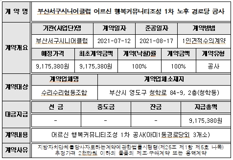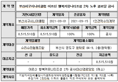 부산서구시니어클럽 2021년 수의계약 공고의 건 페이지 정보 작성자 부산서구시니어클럽 댓글 0건 조회 10,657회 작성일 21-11-24 17:14 본문 부산서구시니어클럽 2021년 수의계약 공고합니다. 목록 이전글부산서구시니어클럽 2022년 노인일자리 담당자 채용 공고의 건 21.12.06 다음글부산서구시니어클럽 사회복지사 채용 결과 안내의 건 21.10.23 댓글목록 댓글목록 등록된 댓글이 없습니다.