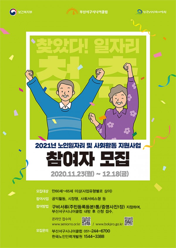 부산서구시니어클럽에서는 아래와 같이 2021년도 노인일자리 및 사회활동 지원 사업 참여자를 모집하고자 공고합니다.