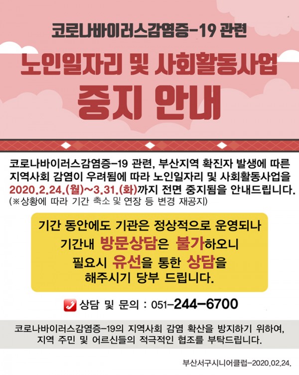 [코로나-19로 인한 노인일자리 및 사회활동사업 중지 변경 안내]