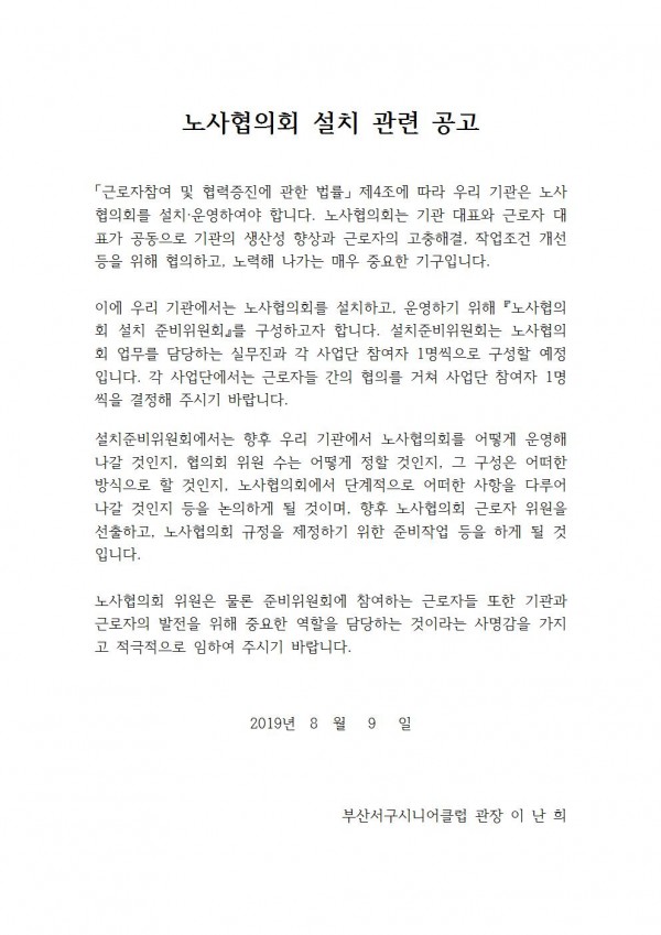 부산서구시니어클럽 노사협의회 설치 관련 공고