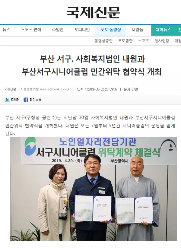 [언론보도:국제신문] 부산 서구, 사회복지법인 내원과 부산서구시니어클럽 민간위탁 협약식 개최