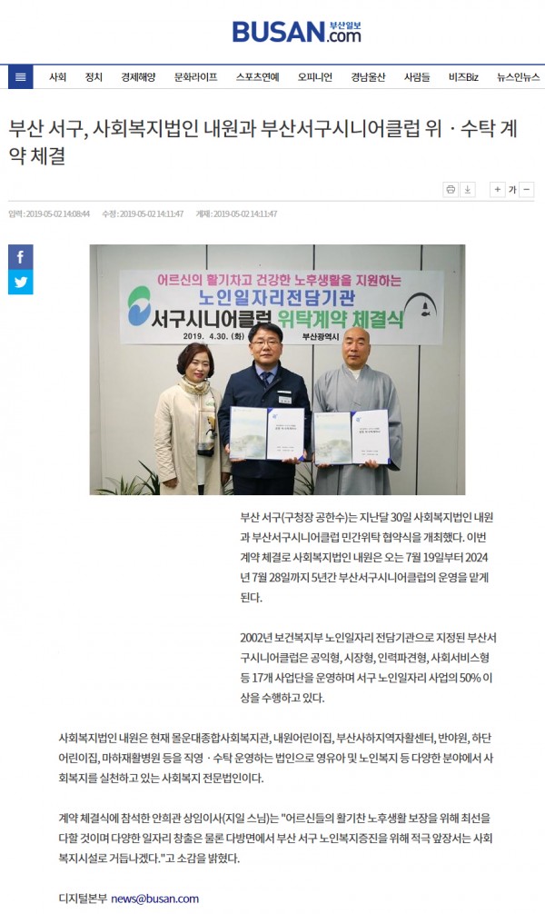 [언론보도:부산일보] 부산 서구, 사회복지법인 내원과 부산서구시니어클럽 민간위탁 협약식 개최