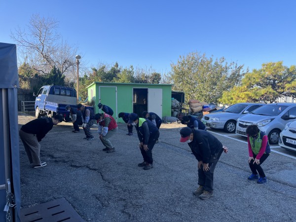 부산시설공단사업단 참여 어르신 활동 전 안전체조 하는 사진입니다.