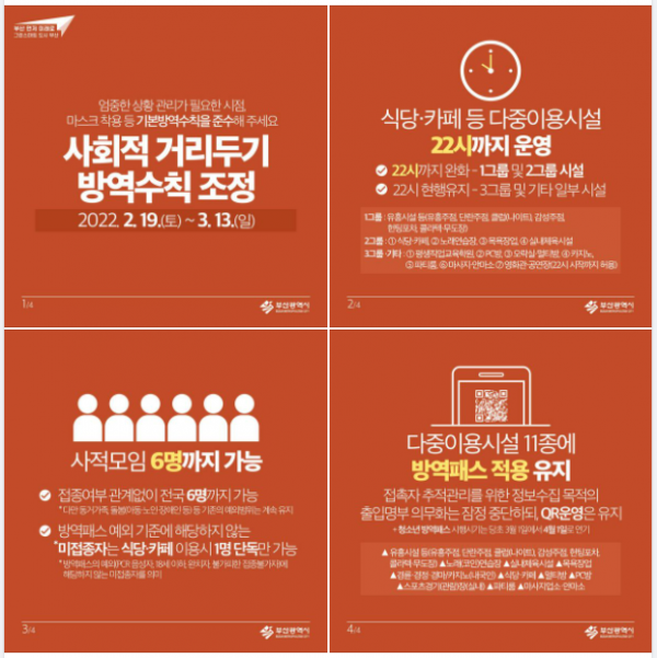 2/19(토) ~3/13(일) 사회적거리두기 방역수칙 조정 페이지 정보 작성자 부산서구시니어클럽 댓글 0건 조회 9,417회 작성일 22-02-22 12:25 본문 2/19(토) ~3/13(일) 사회적거리두기 방역수칙 조정 목록 이전글부산서구시니어클럽 2023년 참여자 모집 포스터 22.12.13 다음글2022년 2월 11일 재택치료 이렇게 바뀝니다 22.02.14 댓글목록 댓글목록 등록된 댓글이 없습니다.