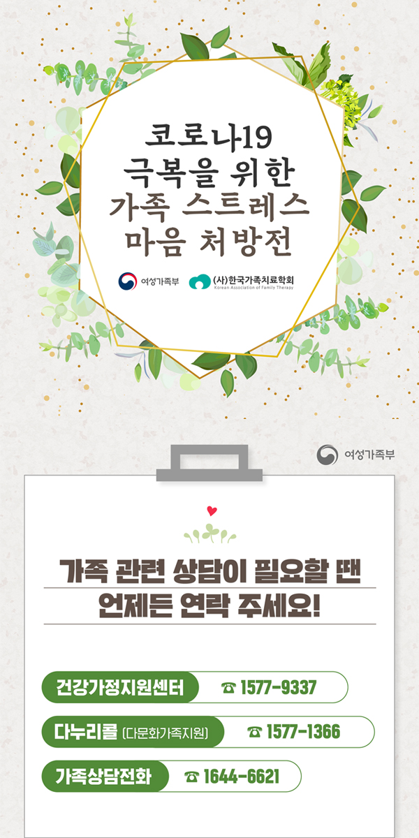 포토에세이 HOME STORY 포토에세이 공유하기 인쇄하기 코로나19극복을 위한 가족 스트레스 마음 처방전 페이지 정보 작성자 부산서구시니어클럽 댓글 0건 조회 10,958회 작성일 20-03-30 11:16 본문 코로나19극복을 위한 가족 스트레스 마음 처방전 목록 이전글코로나바이러스감염증-19 예방 [꼭! 기억해야 할 행동수칙] 20.04.03 다음글[심각단계]에서 준수해야 할 코로나 19 행동수칙 20.03.30 댓글목록 댓글목록 등록된 댓글이 없습니다.